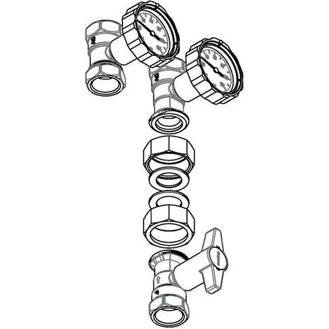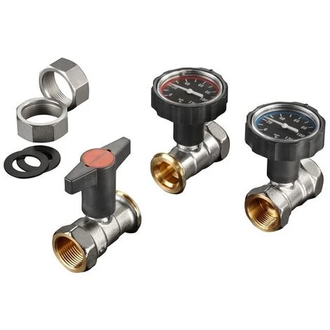 Débit: vanne de pompe à bille avec clapet anti-retour et une vanne à bille de la pompe avec un thermomètre (rouge) Ø 63 mm, ainsi que les écrous-raccords et joints pour les brides de la pompe, inverse: la vanne à boisseau sphérique sur les deux côtés de I